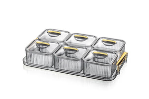 Fie că îl folosești pentru condimente, gustări, sosuri, fructe uscate sau toppinguri, acest set cu 6 recipiente individuale din plastic gros, transparent, cu detalii aurii premium, transformă orice masă într-o experiență sofisticată.